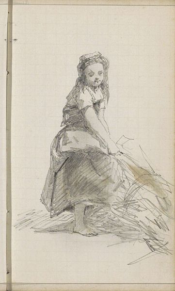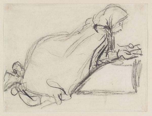 Curator: Welcome. Today, we're looking at "Liggend Meisje," or "Lying Girl," a pencil drawing on paper attributed to Johan Hendrik Weissenbruch, likely created sometime between 1834 and 1903. It's currently held here at the Rijksmuseum. Editor: It's stark, isn’t it? The minimal lines convey such a sense of… stillness. Almost melancholy. The composition focuses intensely on the figure. Curator: Precisely. Notice how Weissenbruch's economical use of line describes the figure’s posture, the fall of light and shadow giving weight to the forms, her simple garments suggesting her social standing. It speaks volumes about the conditions of women’s labor in the Netherlands during the late 19th century. Editor: Agreed. The material reality is important: simple dress and domestic object alongside her speak of simple things. Still, her downward glance generates dynamism which pulls the eye to that part of the composition. I'd be interested in comparing the sketch’s internal lines, and then to compare that, structurally to some sketches by another Dutch master—say, van Gogh! Curator: Weissenbruch, of course, came from a family of painters, he originally learned glass painting but was instructed into watercolors by Anthonie Waldorp. Waldorp's material influence on Weissenbruch's style becomes clearer, especially when you understand he came to encourage the latter in painting landscapes. Weissenbruch's focus here is on this figure within a potential landscape - yet as just the human is sketched, one might expect that the emphasis falls to that field of labour. Editor: Yes, his technique in defining that is intriguing. It almost evokes a dream-like, idealized pastoral, doesn't it? And notice how the figure fills the pictorial space! With all the use of negative space, Weissenbruch draws our focus on that form. The blank paper almost elevates the figure into something… eternal. Curator: To me it feels less idyllic and more a representation of working life at that time, when people were working very hard, with only simple tools and items, trying to find solace wherever they could, whether that be simply a pot of food, a day off. To try and compare such different ways of life misses an element of labour and consumption, to put the drawing back within the field. Editor: A powerful statement regardless, and insightful on many levels! Curator: Indeed, food for thought about labour during Dutch Realism and art!
