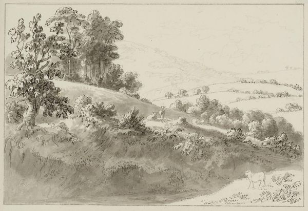 Editor: So, this is "View of Palestrina, seen from the Villa Adriana" by Daniël Dupré, created sometime between 1761 and 1817 using ink, pencil, and paper. There's something really serene and almost dreamlike about it; I get lost in all those layered hills fading into the distance. What stands out to you the most when you look at it? Curator: Ah, yes, Dupré’s eye was remarkably attuned to the poetic nuances of landscape. To me, this drawing isn't just a depiction of Palestrina. It feels more like a memory, a gentle wash of impressions rather than a sharp, photographic rendering. Notice how the ink and pencil work together to create a sense of atmosphere, a sort of visual echo? It whispers of Romanticism's fascination with nature’s sublime power and also its delicate impermanence. Do you sense that slightly melancholic tone as well? Editor: Definitely melancholic, especially with the limited color palette. It's like looking at a sepia-toned photograph from a time long past. And I hadn't considered the "memory" aspect before, but that really shifts my perspective! Curator: Isn't it interesting how a relatively simple landscape drawing can evoke such a complex range of feelings? Dupré gives us the view but invites us to furnish the scene with our own emotions and experiences. What does the landscape tell you, beyond its immediate visual appeal? Does it awaken a longing for simpler times or evoke a sense of timelessness? Editor: Timelessness for sure! Like this scene has always been there, and always will be, people and donkeys trotting across the hillside, generation after generation. I really appreciate how you connected it to memory and the Romantic period. Curator: My pleasure! It's artworks like these that remind us that art isn't just about what we see but what we feel and remember, a window into a world both real and imagined.