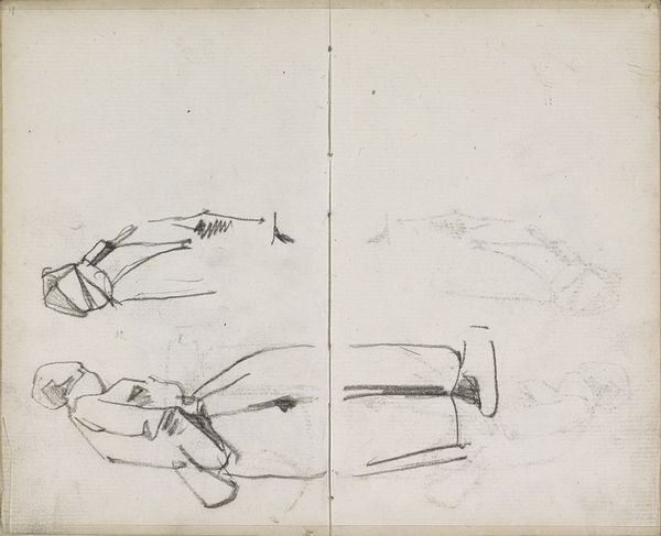 Editor: Here we have "Two Standing Men Facing Each Other," a pencil drawing by Isaac Israels, made sometime between 1886 and 1934. It feels very immediate and sketchy, almost like a snapshot of a fleeting moment. What can you tell me about this work? Curator: Well, what immediately strikes me is the raw materiality. Look at the pencil strokes themselves - the varying pressure, the smudges. This isn't about illusion; it’s about the direct interaction of the artist's hand with the paper. Consider this within the context of Israels’ labor. Editor: How so? Curator: He was a society portraitist, used to portraying bourgeois clientele with flattering precision. These quick sketches suggest something else - a kind of visual note-taking, a process of observing and recording figures from everyday life, possibly the working class, perhaps preparing to produce more ‘finished’ portraits that are saleable to particular segments of society? Consider who the drawings are made *for*, what class is likely viewing this imagery and where it will be hung. Editor: So, you're saying the value isn't necessarily in the finished drawing itself, but in the process it represents? The act of observing and sketching these figures... Curator: Exactly! It gives insight into his method and, by extension, the means of artistic production. This is raw labor before it's refined for consumption. Think of the paper itself – a mass-produced material, cheap and accessible. It democratizes the artistic process, even if the end result caters to a wealthier patron. What do you think it suggests? Editor: It re-contextualizes the “finished” work, making me question the labor behind the fancy portraits, and highlights the art-making as labor. Thank you for this fresh view! Curator: A worthwhile exchange of ideas!