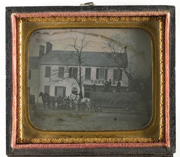 Curator: What strikes you first about this gelatin-silver print, titled "[Headquarters of Captain E. E. Camp, Assistant Quartermaster at City Point, Virginia]," created between 1861 and 1865 by Andrew Joseph Russell? Editor: It’s stark, almost ghostly. The way the light renders the clapboard of the building...it speaks of an austere functionality. Very utilitarian, very practical. Curator: Exactly. Russell was a master of capturing the material reality of the Civil War. Think about the labor involved in constructing these buildings, providing logistics for a massive war effort. The photograph isn't just a depiction; it’s a document of industrial mobilization, reflecting on the resources channeled. Editor: But the figures themselves! Clustered on the porch, they have a stillness. Almost like a posed tableau. It pulls me into a specific narrative beyond just material concerns. There's an echo of classical war imagery. It makes me wonder what visual cues he drew on. Curator: An interesting perspective. I would rather consider what processes determined who appeared in the image, or how photographers positioned themselves and subjects according to established social protocols. The lack of adornment speaks volumes about wartime constraints. Editor: Yet, these constraints shaped meaning too. It speaks to urgency, resolve, and maybe a degree of enforced equality. Consider how their arrangement creates a visual hierarchy of rank and importance, a micro-society visible in the photograph. Curator: Agreed. Thinking about photographic processes and chemical supplies, a limited supply influences aesthetic choices; the restrictions became part of its character, marking that image a product of that specific historical intersection. Editor: So, we’re both seeing the context, but approaching it from different angles. The interplay between the individuals and the structures is interesting and perhaps not coincidental. Curator: Indeed, both can exist to inform interpretations as one traces materials, class structures, labor, and even industrial innovations to the art and its moment of creation. Editor: Well, thank you. This photograph makes you think about everything from classical ideals to pragmatic strategies within its deceptively straightforward form.