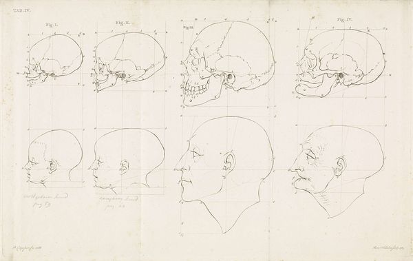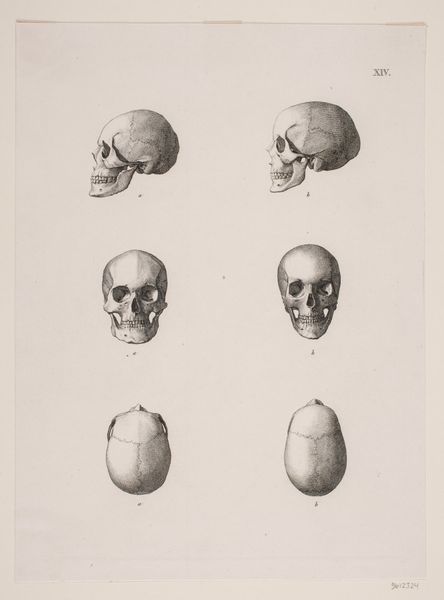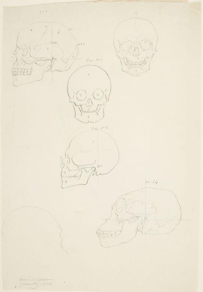 Curator: Ah, a skull! Sort of gives you the shivers, doesn’t it? But in a good way, like a classic gothic novel. Editor: Indeed. What we are looking at here, currently held at the Rijksmuseum, is a pencil drawing titled “Menselijke schedel,” or “Human Skull” created by Jean Augustin Daiwaille sometime between 1820 and 1833. Curator: It’s interesting; it's not just one skull but three different views. Makes it almost scientific. Though seeing them lined up like that, like specimens, there's this eerie quality to the precise draftsmanship that gives the memento mori theme an… anatomical punch! Editor: Precisely. The artist uses academic realism here. Note how this aligns the drawing with traditions of observation. Think of it not just as an object of contemplation, but of study. Skulls, throughout art history, have often stood as symbols of mortality, but the artist renders all the ridges, sutures and cavities visible with scientific precision. Daiwaille seems less interested in preaching and more interested in portraying observable realities, with all their detail. Curator: But still… even rendered with all this academic exactness, a skull retains an unsettling presence, right? I keep coming back to how death stares back at us. It serves as this blunt, inevitable fact in stark form. Editor: I understand that you would draw from the cultural weight of death symbols here. These were produced in the Age of Enlightenment as a reminder, even in moments of study and artistic creation, that even brilliance, ambition and power all lead to the same final phase of being. In contrast with art depicting romantic heroism or pastoral harmony, works like these remind us of limits. Curator: Makes you wonder who this skull once belonged to. What were their dreams, their sorrows? What were they thinking while alive and creating a drawing such as this? Editor: A moment of quiet introspection… It certainly speaks of a profound recognition of the cyclical nature of existence, a theme Daiwaille, deliberately or not, invites each of us to personally witness and embrace.
