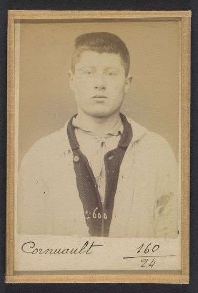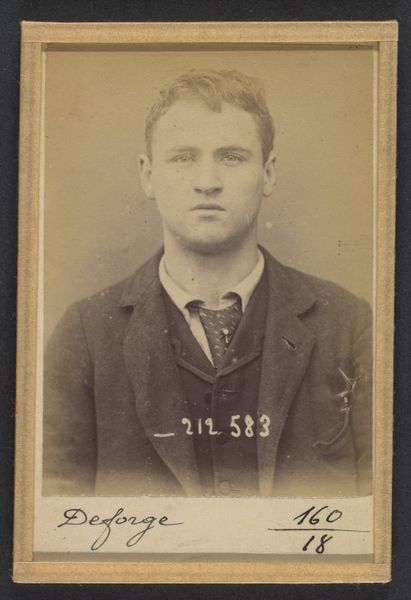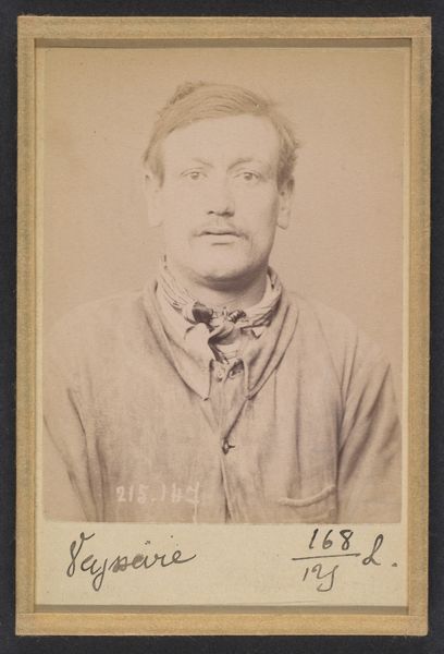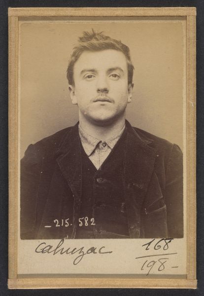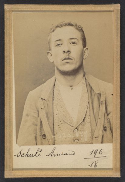 Curator: Alphonse Bertillon's gelatin silver print, "Cana. Eugène, Louis. 22 ans, né à Paris Vllle. Monteur en bronze. Anarchiste. 2/3/94," made in 1894, captures the subject in stark detail. What is your initial read? Editor: A profound sense of resignation pervades this image. His eyes, though fixed forward, hold a certain vulnerability, a quiet acceptance of his fate. The sepia tones only amplify the solemn mood. Curator: Indeed. The print, part of Bertillon's larger project to standardize criminal identification, hinges on objectivity. Consider the flattening effect of the direct lighting and the frontal pose. There's a conscious effort to eliminate artistic interpretation in favor of scientific documentation. The writing just beneath his figure emphasizes his identity, as labeled by the authorities. Editor: But the humanity refuses to be entirely erased. The very details you mention—the stark light, the frontal pose—become elements that inadvertently underscore his individual experience within a system designed to categorize and dehumanize. We can even gather details about his economic status from his somewhat worn blazer and visible button-down. What's more, that Bertillon felt the need to add “anarchiste” betrays the political anxieties of the time. Curator: A valid point. The inscription undeniably infuses a layer of societal prejudice. However, it also highlights the photograph's function as a signifier within a specific framework of law and order. Observe how Bertillon employs the photographic medium to serve the state’s interest in surveillance and control. Editor: Absolutely, the piece lays bare the complex intersections of identity, politics, and power. The subject, Eugène, becomes both an individual and a symbol—a representation of the era's social anxieties and the state's methods of control. It makes one consider how such photographic archives implicate our contemporary modes of data collection. Curator: Precisely. The brilliance of Bertillon's photograph is how it unveils these interwoven concepts, making us contemplate the role of art in recording, reinforcing, and possibly questioning societal structures. Editor: For me, this piece offers a chilling meditation on the individual versus the system. I’m left pondering questions about social justice and the legacy of surveillance today.