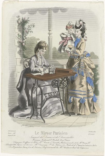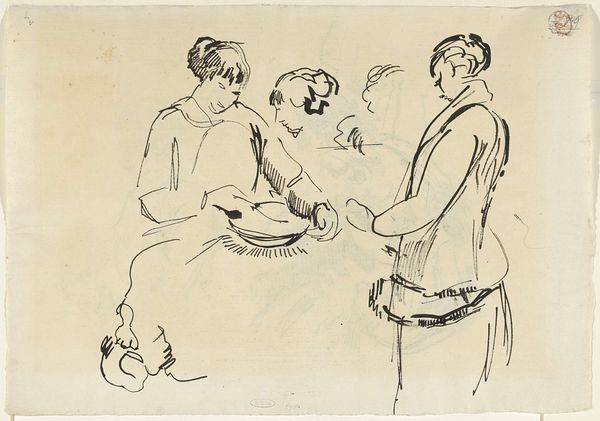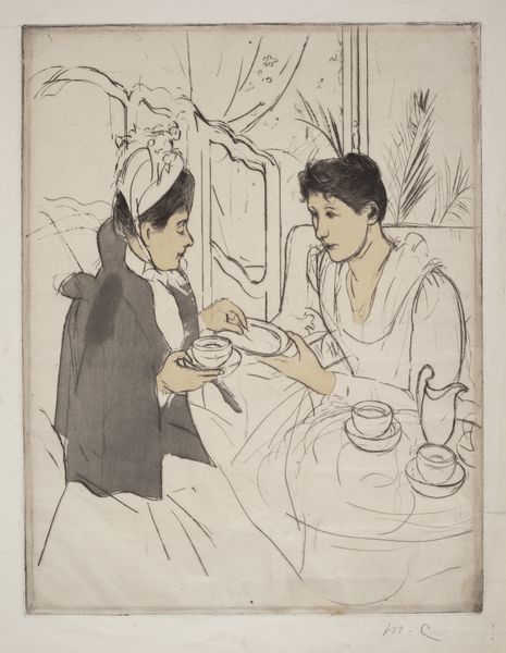 Curator: This is Mary Cassatt's "Afternoon Tea Party". Look closely, and you'll see it's not a painting, but a color print with drypoint and aquatint. Editor: It has such a gentle, domestic feel. The muted colors create a sense of quiet intimacy. Blue seems to be the color that pops up, appearing in the teacups. Curator: Precisely. Cassatt often depicted women in domestic settings, elevating everyday rituals like tea into moments of social significance. The printmaking process itself was significant for challenging academic art hierarchies. Editor: And the teacups! They're like little sapphires, drawing your eye and anchoring the composition. Tea itself has such deep cultural weight, representing connection, hospitality, and shared ritual. Curator: Absolutely. Cassatt's work challenged the male gaze dominant in Impressionism, depicting women's interior lives with empathy. Her use of Japanese print techniques also speaks to broader artistic exchange at the time. Editor: It makes you think about the unacknowledged importance of these private moments in shaping women's social and emotional worlds. It's amazing how much this art can convey with a few visual symbols! Curator: It’s a quiet revolution, really. Editor: Indeed. It truly makes one appreciate the details hidden in plain sight.