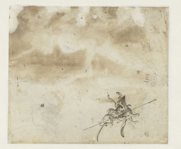 Editor: Here we have Isaac Israels' "Studie, mogelijk van een vrouw met opgeheven arm," created sometime between 1875 and 1934. It's an ink drawing on paper, seemingly torn from a sketchbook. There's a sort of haunting quality to the abstract figure... what's your read on it? Curator: The initial impression is, indeed, one of something fleeting, almost ephemeral. But what interests me most is the tangible quality of the materials themselves: the paper's visible age and toning, the ink's fluidity, even the likely mass-produced nature of the sketchbook itself. How do these humble, readily available materials contribute to our understanding of the artist's process? Editor: That's a great point. You see how the materials, even their "ordinariness," plays a significant role. I hadn't considered the sketchbook as a commodity. Does that downplay its status as fine art? Curator: Not at all. Instead, it democratizes the artistic process. This wasn't a precious canvas acquired from an exclusive supplier, but a simple notebook, likely filled with numerous sketches, ideas, and experiments. We are looking at a mass produced notebook where he uses ink; a commodity and readily available tool, allowing Israels to explore his subject. Does this make the subject – the possible woman – also ordinary, mass producible? Editor: Potentially. Maybe this sketch is less about idealized beauty and more about capturing an everyday moment with simple tools. Curator: Precisely. And consider the labor involved – both the artist's hand in creating the sketch and the unseen hands that manufactured the paper and ink. The means of production are intrinsically linked to the final artwork. The commercial trade in sketchbooks helped enable the freedom of artists to study figure or landscape rapidly. Editor: This has completely shifted my perspective. I was so focused on the figure; I wasn't thinking about the social context of art supplies! I’ll definitely look at materials differently moving forward. Curator: That's the essence of a materialist approach. It reminds us that art is never created in a vacuum. Thank you.