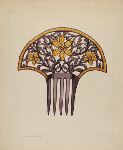 Curator: Let's explore this exquisite watercolor illustration from around 1936, simply titled "Comb." It comes to us from the talented hand of Gordena Jackson. What's your immediate take on it? Editor: The stark contrast immediately grabs you, doesn’t it? That near-black background makes the comb almost luminous. It seems like a straightforward depiction, but with a surprising, almost ethereal quality. It's striking. Curator: It certainly draws the eye. We should remember how such drawings functioned at this time, often as design templates. A comb was more than just a tool; it was a statement of elegance, a highly prized object, particularly within the rising culture of beauty and self-expression taking hold in the early to mid-20th century. Editor: Exactly! And it's crucial to look at the material qualities, here emphasized by the illustrative medium. The drawing focuses our attention on what the comb would be made of: maybe tortoiseshell, or perhaps celluloid, carefully carved and shaped, each swirl reflecting the artisanal labor involved. The materiality speaks of both luxury and a developing industrial process attempting to imitate natural beauty. Curator: A very fine point. It speaks volumes about aspiration and access. Was this luxury within reach for the masses or a signifier of a more elite social class? Think about the role of illustrated catalogues, advertisements, even fashion magazines, in creating and feeding these desires. The politics of imagery at work... Editor: And let's not forget how gender is deeply woven into the very concept of beauty, labor and artistry. Combs are associated with a certain set of traditional beauty rituals, and here Gordena Jackson transforms a humble, domestic item into something approaching art. Curator: Yes, elevating the everyday is very powerful. Jackson’s artistic talent offers a way of engaging with accessible and fashionable artifacts as statements within broader societal trends and, further, invites critical discourse. Editor: In the end, whether mass-produced or crafted by hand, a comb remains a tangible connection to daily practices and shifting ideals of feminine appearance, revealing social strata through its presence and use. A single tool carries all this weight. Curator: It's fascinating to consider how one detailed representation can evoke so many wider cultural dynamics, just waiting to be noticed in the composition of something as mundane as a comb. Editor: Precisely! Next time you encounter a seemingly ordinary object, take a second glance, for embedded inside you may discover hidden realms, stories etched in its very making, its significance beyond mere practicality.