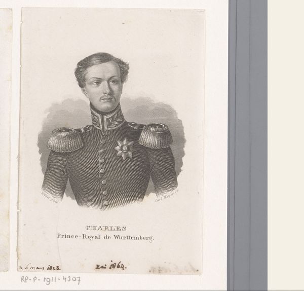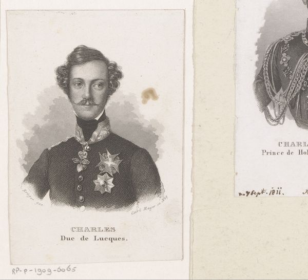 Editor: Here we have a print from 1836 by Carl Mayer titled "Portret van Carlos María Isidro Benito de Borbón y Borbón-Parma," or Portrait of Don Carlos. It’s quite a formal portrait, rendered in meticulous detail, almost photographic in its clarity. I'm immediately struck by the context of monarchy, clearly signaled by the medals and regalia. How should we interpret this piece considering its historical context? Curator: The context is key. This print wasn’t just an artistic representation; it served a political function. Carlos María Isidro was a claimant to the Spanish throne. Prints like these circulated widely, shaping public opinion and solidifying his image as a legitimate ruler, regardless of actual political authority. Think of this print as early political propaganda. Notice the Neoclassical style— the focus on idealized, rational order, suggesting stability and authority, traits a leader would want to project during political turmoil. Editor: So, its Neoclassical style is part of its persuasive power? By referencing classical ideals, it implicitly claims legitimacy? Curator: Exactly! It evokes a sense of enduring tradition. Who was the target audience, and what were their existing beliefs? Such images helped construct a narrative around Don Carlos, vital for maintaining his support base, particularly during the Carlist Wars fought over succession. These wars deeply impacted Spanish society and political landscape, something the artist definitely understood. Editor: That makes me see it differently. It's not just a portrait; it's a carefully constructed argument about power and legitimacy during a time of significant social upheaval. I hadn’t fully considered the print’s role in actively shaping the political landscape. Curator: It's a potent reminder that art is rarely created in a vacuum; socio-political forces always play a crucial role in both production and reception. Now, how do you think the means of production -- being a printed image available for mass production -- factored into its social impact at the time? Editor: I see. Understanding how easily these images could be distributed gives even more importance to its symbolism. Curator: Precisely. Keep that in mind, as that could offer even more information about Carl Mayer's creation!