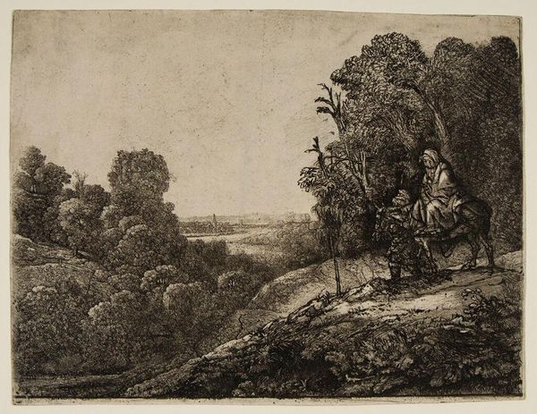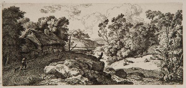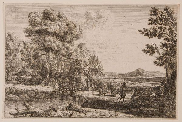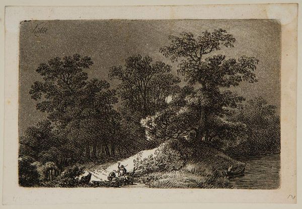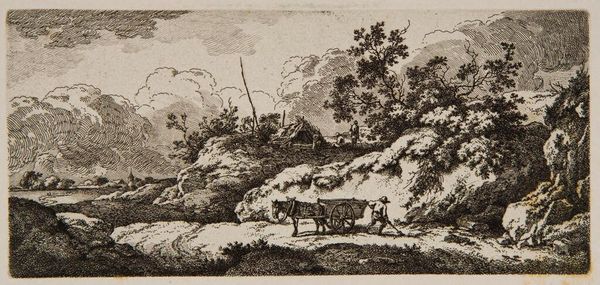 Editor: Here we have Ferdinand Kobell's etching, "Cascade." It feels like a snapshot of a specific moment in time. What social dynamics do you see embedded in this landscape? Curator: I see a deliberate construction of nature, framing it as a space accessible primarily to a privileged class. The figures on horseback, positioned prominently, are they landowners, perhaps? Their presence within the landscape subtly reinforces a power dynamic, a claim of ownership and control. Editor: That's fascinating! I hadn't considered the power implications. Curator: Consider also who is missing. Where are the laborers, the indigenous populations? Their absence speaks volumes about the historical narrative being presented. Editor: It really changes how I see the image now. Thanks for pointing that out. Curator: My pleasure. Hopefully it inspires critical reflection.