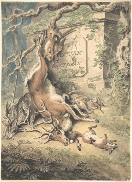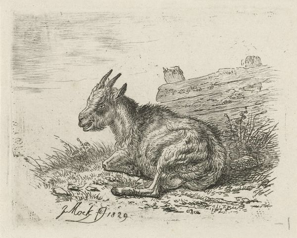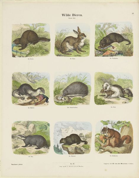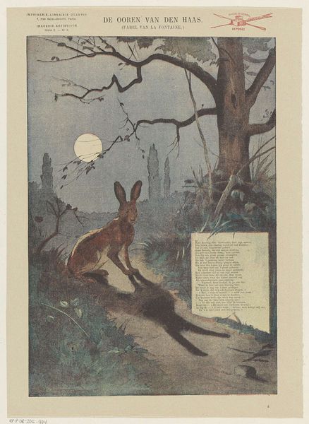 Editor: We're looking at "Lièvre. / Lepro. / Hase. / Hare. / Haas" by firma Joseph Scholz, created sometime between 1829 and 1880. It’s a print of two hares, one standing and one grazing. I find the composition interesting with its division of the picture plane into zones and varied colors. What do you see in it? Curator: The arrangement is indeed noteworthy. Observe how the standing hare bisects the composition vertically, creating a strong central axis. The chromatic scale employed exhibits an interplay between muted earth tones and the verdant landscape behind. Is it perhaps a structured method to convey symbolic importance using shape? Editor: I hadn’t thought about it that way. The division certainly brings the eye directly to that upright hare. Do you see any purpose in the varying focal depth, which directs a second visual axis away from the vertical zone of the standing hare? Curator: Precisely. Consider the contrast: the standing hare, sharply delineated, versus the subtly blurred background. This juxtaposition creates visual stratification, perhaps suggesting a hierarchy of existence within the piece or a dichotomy in its meaning. Could it function as a comment on the role of nature within a social stratum? Editor: That's insightful. I was just seeing a picture of hares, but there is certainly visual evidence to back your interpretation. Curator: Formal analysis unveils layers beyond mere representation. This artwork, seemingly simple, demands contemplation of its construction and articulation of a purpose. The elements here form a visual dialogue with the artist communicating in the language of color and composition. Editor: Thanks. I have much to learn on the impact of the underlying composition and its effects on our perception.