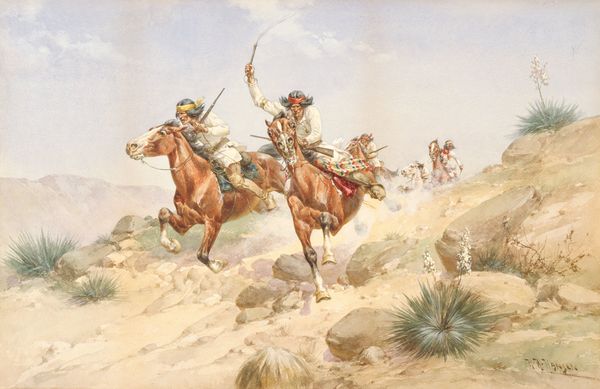 Charles M. Russell created this watercolor painting, Nobleman of the Plains, with sweeping strokes and diluted washes, emphasizing the work’s structural elements. The composition creates a dynamic visual experience through its strategic arrangement of line, color, and form. The painting captures a Native American on horseback, rendered with an emphasis on the play of light and shadow. The horse and rider are depicted in motion, with the flowing lines of the horse's mane and tail, as well as the rider's posture, suggesting movement across the plains. The artist's choice to use watercolor allows for fluid, almost ethereal rendering of the scene. The color palette is dominated by earthy tones. This artwork serves as a cultural artifact, preserving a moment and a way of life increasingly threatened by the encroachment of Western expansion. The nobility of the Plains Indian is subtly conveyed through the composition and the artist’s style.