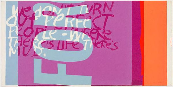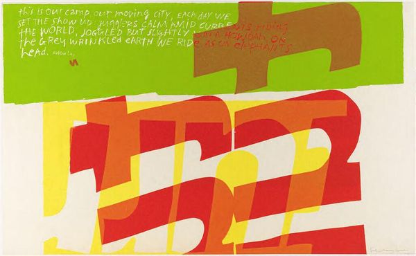 Curator: Corita Kent's screen print, titled "one way," presents a bold exploration of color and form. Look at how the red and blue interlock. Editor: It's vibrant, almost aggressively so. It feels like a visual shout, doesn't it? Those stark color contrasts hit you right away. Curator: Indeed. Note how Kent layers fragmented text amidst abstract shapes. Semiotically, the interplay challenges conventional modes of reading. The text becomes both message and visual element. Editor: Right, it's a collage of words and shapes. "ONE WAY" really pops, but then you notice all these little snippets around it. It’s like a visual poem. Curator: Precisely. And consider the socio-political context of Kent's work. Her embrace of pop art aesthetics served as a means of democratizing art, making it accessible. Editor: It feels like a call to action, a burst of energy for change. The imperfections give it a very human feel; it's not trying to be slick or polished. Curator: An astute observation. The piece deftly merges formal innovation with social commentary. Editor: I’m walking away with a feeling of optimistic rebellion. It’s like a little jolt to the system.