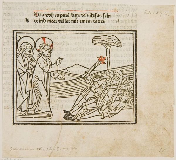 Curator: Here we have an intriguing, though anonymously created, image entitled "Carrying the Ark of the Covenant," currently held at the Harvard Art Museums. Editor: It strikes me as austere, almost deliberately simplistic. The linear nature and the muted palette create a sense of solemnity. Curator: Indeed. The Ark, visually, is presented as a rather basic chest, yet it's elevated by those carrying it, giving form to an idea. Editor: The symbolic weight of the Ark is immense; it represents God's presence, law, and covenant with the Israelites. Its very image evokes power. Curator: And the lines...the artist uses hatching and cross-hatching not just to render form, but to suggest texture and weight, especially in the robes of the carriers. Editor: Yes, the visual language really drives the narrative. It’s a potent reminder of cultural memory. Curator: Ultimately, it is a beautiful example of how basic elements can create something powerfully evocative. Editor: An exercise in visual economy, which amplifies its symbolism through simplification.