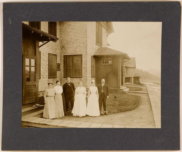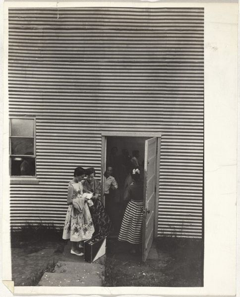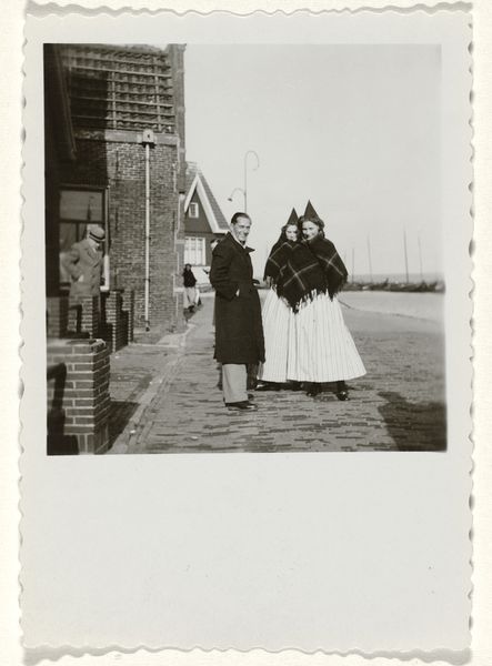 Curator: This gelatin silver print, taken sometime between 1956 and 1970, presents a candid scene identified as “Gideon Elon, the third husband of Isabel Wachenheimer, in a Dutch city next to three women in traditional Dutch clothing and an unknown man.” Editor: Wow, that's quite a mouthful of a title! My first thought? This has a slightly unsettling energy. Like a documentary film still just before something… shifts. There's such formality combined with utter casualness in the arrangement. Curator: I find it compelling how the photographer captures the dynamic between cultural performance and lived experience. Consider how these women, seemingly representing Dutch tradition, are juxtaposed against Elon and the other man who appear as contemporary figures, suggesting a negotiation between belonging and otherness, especially when viewing this through post-colonial lenses. Editor: Yes, the staging feels intentional but… awkward. There's something performative but also so closed off. Almost as if those ladies have their own private language and world and are politely tolerating the…outsider's photograph. It's that distance, both social and visual, that resonates. What does "being Dutch" even signify in this era, in that light? Curator: Indeed. This piece resonates within discourses around identity construction, particularly in the mid-20th century. It calls us to question what traditions get highlighted, who benefits from their preservation, and at whose expense they may operate. What does tradition signify in a globalized, post-war Europe? And how does this impact identity negotiation? Editor: I find myself drawn to that ambiguous other man as well. Lost between those layers of prescribed Dutch Identity, almost dissolving into it. This photograph raises more questions than it answers, leaving you feeling oddly out of place. I almost hear whispers. Curator: Absolutely. That subtle visual friction invites us to deconstruct representations of national identity and explore how notions of belonging and exclusion are inherently intertwined. It invites discourse beyond surface-level observations. Editor: Well, beyond what is immediately visible and "known", this piece pushes you towards a different sense of "seeing".