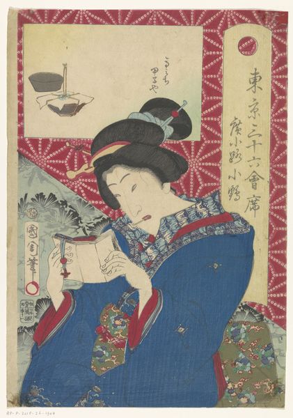 Tsukioka Yoshitoshi created this woodblock print titled, "Looking weighed-down - The appearance of a waitress at Fukagawa in the Tempo era". Notice how the composition directs our gaze to the waitress's face, framed by her elaborate black hair and the weight of the table she carries. The artist uses a muted palette, dominated by blues and reds, yet it’s the texture achieved through the woodblock technique that adds depth. Consider the semiotic implications here; the weight she bears symbolizes not only a physical burden but perhaps a social one as well. This image destabilizes conventional notions of beauty and labor. Yoshitoshi challenges the viewer to reconsider the values assigned to service and appearance. The textures of the print are not merely decorative, they contribute to a deeper understanding of the subject's emotional and physical state. The materiality, therefore, functions as a key component in the broader discourse of labor and representation. This invites ongoing interpretation and reinterpretation of the waitress’s lived experience.