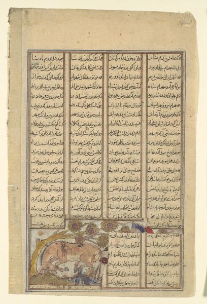 Editor: This is "The Combat of Rustam and Ashkabus," a painting on a folio from a Shahnama, or Book of Kings, made sometime between 1305 and 1365. It’s currently held at the Metropolitan Museum of Art. The composition is striking – a vibrant scene of horses and warriors frozen mid-battle, all framed by lines of text. What do you see in this piece? Curator: I see more than just a battle; I see a clash of ideologies, power dynamics expressed through the bodies and the text surrounding them. This miniature exists within a specific historical and political context, representing an era of cultural flourishing but also societal hierarchies. Notice how the artist positions Rustam, his dominance emphasized, potentially reinforcing a particular narrative about heroism and leadership prevalent during that time. Who is privileged in this telling and who is erased, and why? Editor: That's fascinating. I was focused on the action, but now I’m thinking about how the artist's choices reinforce social structures. The size and positioning of Rustam certainly commands attention. Curator: Exactly! Consider also the function of the *Shahnama* itself. It’s not just a collection of stories; it's a historical and cultural touchstone. How might illustrations like this contribute to shaping a collective Iranian identity, particularly in relation to its leadership and the construction of ideas around "heroism?” Do we view “The Book of Kings” as an activist, a preserver, a critical piece? Editor: I hadn't considered the idea of this work actively shaping identity. I am familiar with that happening in more contemporary artforms. Curator: Think about who had access to a lavishly illustrated manuscript like this? Patronage shaped not only the aesthetic qualities, but also its meaning. And who might have been excluded from this narrative? Considering these elements allows us to unearth some of its powerful social functions. Editor: That's a really powerful way of looking at it. It's made me think about how we engage with art from the past – not just as pretty pictures, but as active participants in a much bigger story. Curator: Precisely. Seeing art as a point of intersection for culture and philosophical values can give us great insight into why art continues to be one of our species’ longest running traditions.