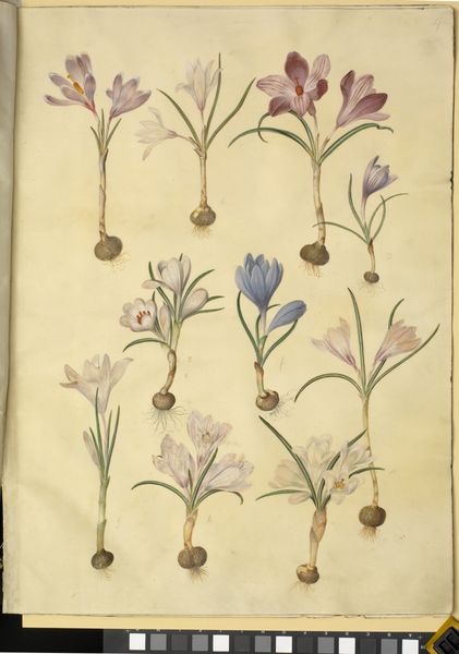 Curator: Here we have a botanical illustration by Hans Simon Holtzbecker, created sometime between 1649 and 1659. It's titled "Prunus dulcis (mandel); Prunus persica (fersken)" and depicts, as the title suggests, almond and peach blossoms. Editor: What strikes me is how delicate and precise the rendering is. The way Holtzbecker uses gouache and watercolor creates this wonderful luminosity. The composition is beautifully balanced; the positioning of each branch almost mirror each other across the page. Curator: Botanical illustrations such as these were not only artistic endeavors, but served a very specific function. This drawing, part of a larger codex, was likely commissioned for scientific purposes. Such meticulously detailed images aided in the study and classification of plants, reflecting the era’s growing interest in natural history. Also the book’s commissioners would display books such as these to demonstrate status as a man or woman of science. Editor: Absolutely, and you can see the artist has prioritised accuracy and detail above all. Each petal, each leaf is rendered with such careful attention, there is very little embellishment, if at all. It’s a far cry from the more dramatic and overtly symbolic paintings we see elsewhere in the Baroque period. Curator: The context here is vital. The 17th century saw a surge in global exploration, trade, and subsequent exchange of plants and other items. Botanical illustrations thus played a key role in documenting and disseminating knowledge about newly discovered species, as a show of dominance over those lands and resources, for many empires throughout the world. Editor: Though presented scientifically, the delicate rendering softens this a little, bringing forth this inherent, natural elegance that you see throughout. Observe how the artist carefully mixes shades of pink and green and the detailed execution of each leaf to construct depth and volume; not easy feats within this medium! Curator: Yes, viewing it with our modern understanding of science, the picture speaks about the period when such distinctions were not present and science was for the aristocratic, or extremely wealthy members of the community. Editor: I find it truly compelling. Holtzbecker’s command of line and color captures the inherent delicate allure of the subject matter. Curator: A perfect intersection of art, science, and power; offering a window into the era’s obsession with natural inquiry and, in part, dominance through natural discovery.
