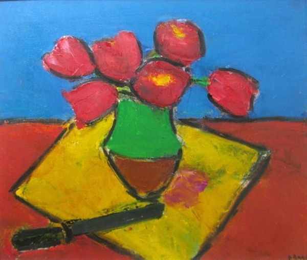 Curator: Before us, we have "Still Life With Tazza and Seashell" by Ion Pacea. It appears to be acrylic on canvas. The work engages with still life traditions in an intriguing modernist vein. Editor: The first thing that strikes me is the intense, almost clashing colors. That blazing orange against the black background, it really sets the objects into stark relief. And there’s this definite flattening of space. What era are we placing this in? Curator: There's no date, but with the stylistic elements we can align this to aspects of early 20th century modernism. You picked up well on the color usage; Pacea manipulates the conventions of painting here. By applying these jarring hues he creates a striking piece, which for me speaks to the shifting cultural landscape of the 20th century in Romania and its relationship to larger global currents. Editor: It feels like it could also have links to post-colonial thinking. If you consider that traditionally "high art" was preoccupied with certain academic practices, still life would reflect access to goods for certain segments of the population, and the choice of items included. Do you think there are statements about class dynamics going on? Curator: I think there's an inherent social critique that happens by deconstructing the concept of access to artistic and creative practice itself. Fauvism challenged that very notion of fine art from above. Editor: But, it's difficult to view these still lifes outside of the cultural narratives and societal conditions that shape the creation of that very painting. Even now, the art world reinforces systems of wealth and exclusivity, right? Curator: I'm less inclined to interpret the seashell through that very particular lens. From a more objective perspective I think there's a very considered method applied to its presentation. It doesn’t necessarily break with still life, it expands upon it in a novel way, wouldn’t you say? Editor: Expanding upon is a good way of framing it. The raw material nature is presented with modern interventions and interpretation. I’m glad we got to view that closely. Curator: As am I. Its treatment as raw materiality within its own artistic agency remains important.