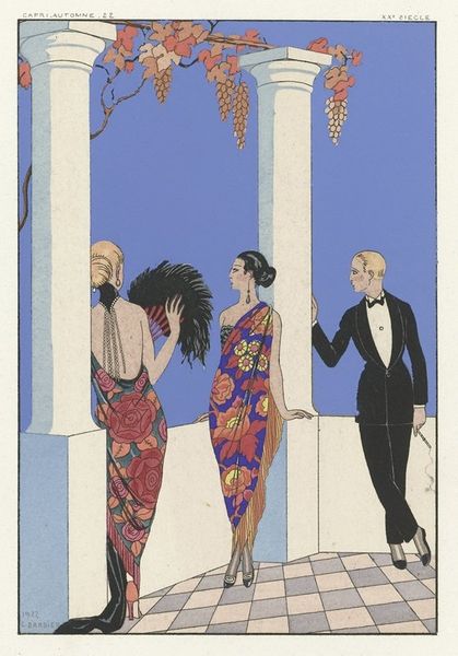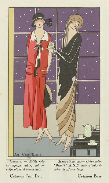 Curator: This is a print from "Art-Goût-Beauté," a page from a 1926 issue showcasing the elegance of feminine fashion during that era. It presents creations by Premet and Doeuillet. Editor: My first impression is that it evokes a mood of sophisticated leisure. The composition, with its elegant figures, suggests a particular vision of female identity, both glamorous and subtly rebellious. Curator: Absolutely. And consider the context: this appeared during a time when women were actively renegotiating social norms and gender expectations. The figures are holding cigarettes. It’s representative of new liberties taken with representations of women in visual culture. The figure in gray is attired in the "Mirliton" design. Editor: That’s right. This illustration's emphasis on textiles is key. I am curious about the production involved, since we know this was part of a monthly periodical of "feminine elegance". Consider the layering of meaning between labor and consumption with dresses created from crepe de chine and silk mousseline. It poses a question of accessibility versus aspiration. Curator: Precisely. The styling choices certainly emphasize a form of material wealth that, in some ways, excluded a certain group of the population at the time. Editor: Well, the design itself presents us with clear intention of visual seduction, and it's rendered using techniques to communicate very clear instructions for what can only be assumed was upper middle class clientele. The use of color lithography, too, allowed for these designs to be shared very widely at a reasonable cost. Curator: I think what is truly significant here is how these kinds of publications shaped perceptions of the ideal modern woman during this period, further reinforcing the intersections of gender, class, and artistic expression. Editor: It provides insight into the intricate relationships between creative processes, manufactured commodities, and the daily experiences of consumption. I keep coming back to what it means to put an economic framework onto "beauty" through clothing during the 20's. Curator: Looking closely at the cultural context, and thinking of labor, class and accessibility, these works are an important study for anyone who is hoping to gain an understanding of the modern woman during the beginning of the twentieth century. Editor: Absolutely, examining its composition gives a tangible understanding of art deco illustration from that era!