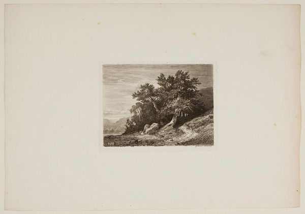 Curator: Alexandre Calame, a Swiss artist from the 19th century, created this work. It’s titled "Valley Stream with Cattle." What's your initial take? Editor: It feels…intimate. Like stumbling upon a secret, quiet moment in nature. The monochromatic palette enhances the sense of stillness. Curator: Indeed. Calame often sought to capture the sublimity of nature. Here, though, it’s less about grand vistas and more about the everyday. The cattle drinking add a layer of pastoral life. Editor: I'm interested in the composition. The stream acts as a visual pathway, guiding the eye deeper into the scene, while the trees frame this gentle moment beautifully. Curator: Right! It's fascinating how he balances detail and a broader sense of atmosphere through the etching. Editor: It really emphasizes the contrast between light and shadow. I find that it evokes a sense of calm and serenity. A perfect escape from the world's noise. Curator: A lovely distillation, I think. Calame shows us the beauty in simplicity here. Editor: I concur. It’s a reminder of how nature offers both solace and joy.