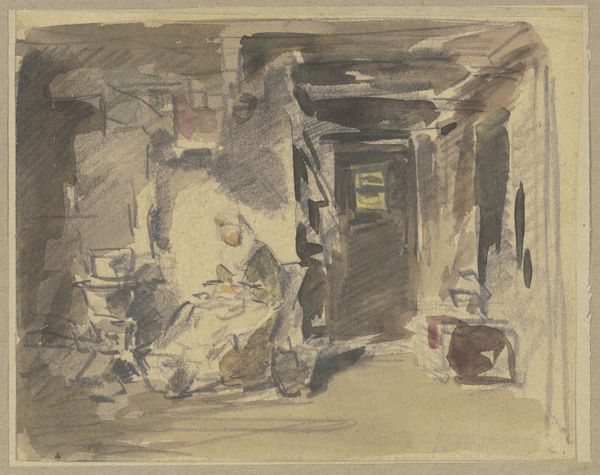 Editor: This watercolor work is titled "Gezicht in een boerendeel", which roughly translates to "View in a Farm Part". Painted by Hendrik van der Burgh, sometime between 1779 and 1858, it gives us this incredibly intimate glimpse into, well, farm life. It’s making me think about stillness, honestly. So muted and quiet. What leaps out at you? Curator: Stillness is a brilliant first impression. I find myself sinking into the grey tones, which at first glance appear monotonous but upon closer inspection reveal themselves to be a spectrum. See how the light catches on the pail, the suggestion of use, daily rhythms? I feel a strange harmony, a meditation on simple domesticity. There’s a certain vulnerability here, wouldn't you say? It's so unpretentious. Editor: Definitely! It feels like peeking into someone's private world, and they're not even trying to impress. Does the artist’s choice of watercolor – a medium often associated with fleeting impressions – impact your view of the artwork? Curator: Absolutely! Watercolor lends itself so beautifully to capturing these transient moments. The transparency, the almost accidental drips, all add to the sense of immediacy, of catching a scene in the act of unfolding. It’s as if Van der Burgh whispered, "Let me show you this quiet corner," before it disappeared forever. It also asks what remains of daily lives when we no longer live them. What cornerstones did they leave in our society and why? What’s more vulnerable than something we may never even know happened? Editor: It's funny, I went in thinking, "gray equals boring," but now I see it’s about uncovering layers of beauty in the everyday. I really love that. Curator: Exactly! The beauty isn't splashed across a canvas; it's discovered in the hushed tones of a routine life, rendered so skillfully, with an understated and reflective approach. Thank you for spotting that little, hushed gem!