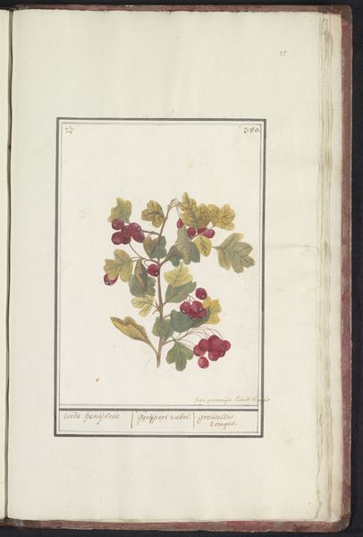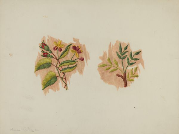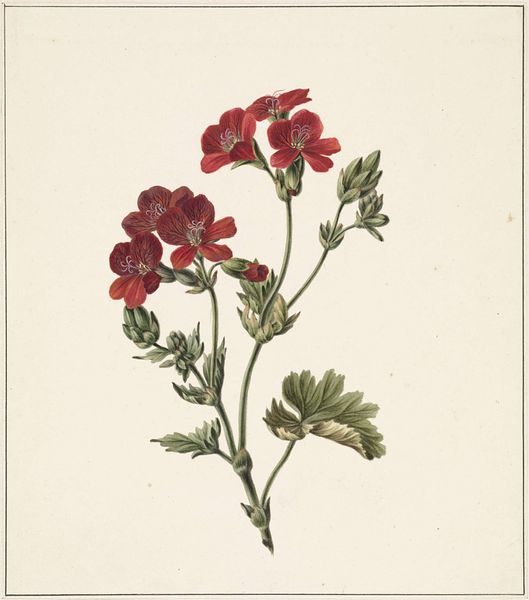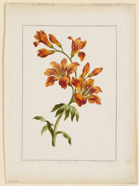 Curator: Take a moment to observe "Flower Print No. 26," created around 1788. This lovely watercolor painting on print by John Edwards is housed right here at the Minneapolis Institute of Art. What's your immediate impression? Editor: It feels… gentle. A bit like a forgotten page from a very polite garden diary. The muted oranges and greens against the pale paper are so delicate, like a whisper of summer. Curator: Edwards lived and worked in an era where botanical illustration held significant scientific and social value. Remember, this was the Enlightenment. Plant collecting and classification were passions, tied to expanding global trade and knowledge. Editor: You can almost feel that scientific spirit! It's interesting though because instead of feeling dry and academic, it really pops. It’s as if he saw the plants, you know, not just as specimens, but like each bloom was a character in a botanical theatre. Curator: It’s fascinating how botanical illustration served these multiple functions. It was both scientific record and a display of cultivated taste. Think about the social context: owning prints like this displayed knowledge and affluence. Editor: I can see that, absolutely! It is so funny to see how it becomes part of someone's identity to be so knowledgeable of something like flower art. You wonder if at the time, were there different flower art sub-cultures, maybe ones that even fought with each other over stylistic differences? Curator: The watercolor medium lends itself well to the meticulous detail required for accurate representation, yet it also allows for subtle nuances in color and texture. Edwards successfully walks that line, achieving scientific clarity while retaining a sense of artistic expression. Editor: Exactly! And maybe there really *is* some underlying element in the image that suggests Edwards wanted to highlight his subject through an emotionally salient point. Or, I guess we just keep projecting our thoughts on this, haha. Either way, lovely work that inspires thought! Curator: A thoughtful engagement, indeed! Thank you for sharing your perspective on this historical flower print. Editor: Thanks for having me! It is truly a testament to the value and meaning one finds when simply taking a step back to really view things with deeper thought and intention!