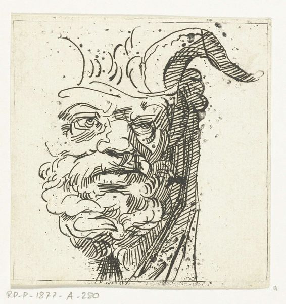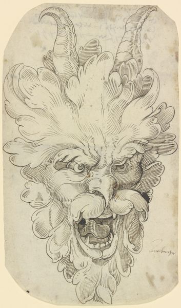 Curator: Look at the ferocity! It's a bit unsettling at first glance, wouldn't you say? Editor: It is, but a controlled unsettling. The tension in the face is almost theatrical. This intaglio print, "Satyr's Head" by Adamo Scultori, thought to be made between 1566 and 1580, showcases Scultori's incredible control over the line. The etching breathes Mannerist drama, and it's part of the collection at The Metropolitan Museum of Art. Curator: The figure's expression and goat-like features feel as if the veil has lifted to reveal something elemental. There's that ancient, pre-Christian symbolism, but filtered through a very deliberate Renaissance lens. Editor: Exactly. See how the line weight varies, creating volume and depth in an almost sculptural way. The controlled chaos of the hair, the shading around the eyes—it all contributes to this sense of contained power. It almost feels as if the subject might erupt from the page. Curator: It does invoke raw instinct. The satyr is a liminal figure, caught between man and beast, symbolizing the wilder aspects of human nature. That leering grin – does it threaten or taunt? The satyr exists outside of social order, allowing viewers a forbidden glance into the primordial id. Editor: Absolutely. The rendering style enhances this uncivilized sense. There’s a freedom to the handling of line and form. It makes one feel like the satyr's emotions—the uninhibited passion—might suddenly burst forth from within the constraints of representation. Look closely, for instance, at how lightly sketched and incomplete the horns are. Is the incomplete the suggestion here? Curator: Perhaps it represents our ever imperfect attempt to portray and control forces like instinct. He offers insight into what Jung calls "the shadow," or the hidden parts of self. Editor: What really holds my attention is the intricate etching. The texture Scultori manages to coax from ink on paper transcends mere depiction, pushing toward actual sensation. Curator: To understand the art, and our reactions to it, is to explore something central about the human condition itself. Editor: Yes, the work embodies so much about the period while engaging the primal fears that persist today. Thank you for speaking with me.