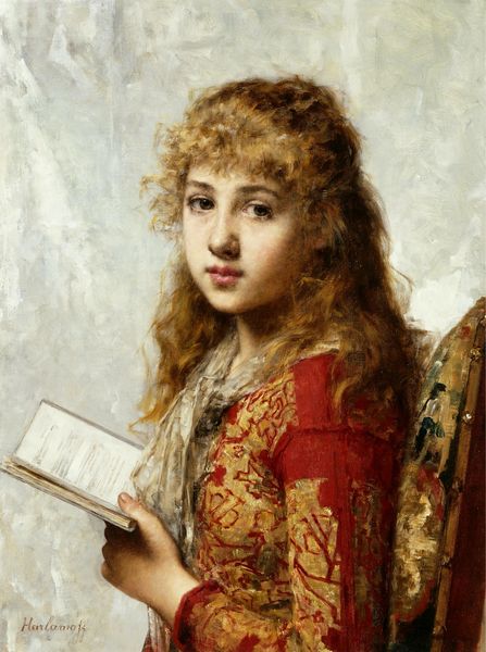 Editor: This is "The Red Cloak," an oil painting by Jules Joseph Lefebvre. It definitely gives off a solemn, almost dreamlike feeling to me. The woman's gaze is directed upwards, and that rich red is captivating, a striking color. What draws your attention most when you look at this work? Curator: That red is quite something, isn’t it? It envelops the figure, drawing us in, but there’s a luminosity too, emanating from the subject’s face and hands. Notice how that light guides you through the narrative, as if her very thoughts are being illuminated. To me, it whispers of devotion, perhaps quiet desperation. Lefebvre captures a moment of intense inwardness. Editor: Desperation, that's an interesting interpretation. I saw a more hopeful, almost serene expression. Is that red symbolic, do you think? Curator: Absolutely. Red can be a paradox, right? Passion and danger, love and sacrifice… In this context, coupled with the book and the upward gaze, it seems less about earthly passions and more about spiritual yearning, wouldn’t you say? It reminds me of medieval devotional paintings where color was often used to express religious fervor. Editor: That makes a lot of sense. So it's less about, say, romantic love, and more about a higher power? I guess that’s why the "red" dominates rather than distracts. I missed that entirely. Curator: Precisely! See how the eye is led? The genius lies in making bold colors a doorway to introspection. The simplicity of the composition only amplifies this effect, don’t you think? What I find really engaging is trying to unlock her private universe, the emotions painted between the lines, or rather, the brushstrokes. Editor: Well, I certainly have a different appreciation for that cloak now! It makes me want to seek those kinds of emotional details hidden in other works. Curator: That’s the beauty of art, isn’t it? It reframes how we see, and then, in turn, how we feel.