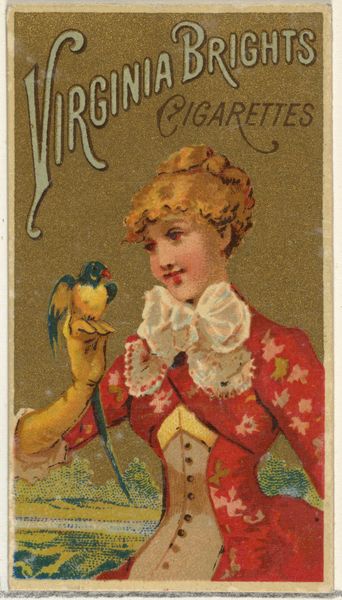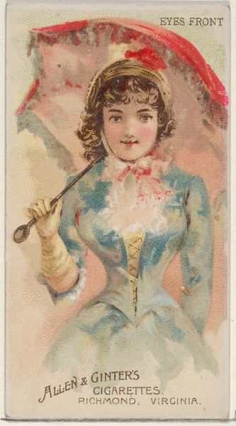 Editor: This is "Fire," one from a series called "Parasol Drills" created in 1888 by Allen & Ginter as a cigarette card. It's a color print, so small and delicate. She seems like an advertisement attempting elegance, but the whole image feels a little unsettling. What do you see in it? Curator: My eye is drawn immediately to the umbrella – more precisely, the parasol – she holds so casually. Don't you think it's curious that it’s labeled ‘Fire’? This era loved allegory. Consider the parasol – a shield against the sun's fire, but also suggestive of protection and societal expectation. Editor: Protection, sure, and keeping pale was seen as fashionable then, so maybe guarding against sun… What societal expectations, though? Curator: Observe how controlled she is, gloved and tightly dressed, almost contained despite the flamboyance of her hat. It's a study in contrasts, isn’t it? This card carries echoes of a woman both embracing and being confined by social conventions. Fire is powerful, transformative. Controlled, it's domesticity. Uncontrolled, it's…well, something other than what is promoted. Editor: That's…a bit darker than I initially thought. It is interesting, this dance between outward appearance and maybe, inner desire? Curator: Indeed! These images were never "just" advertisements. They reflected and reinforced desires, fears, and values. Look closer next time – the most innocuous images often conceal the richest cultural memories. Editor: I never considered the power of suggestion within everyday objects and how that can speak to the complex emotions and roles within that timeframe. Thank you! Curator: It has been a pleasure to explore this symbol, hasn't it? Looking back, even through ephemera like this, offers the most nuanced glimpse into who we were, and are.