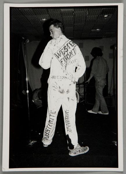 Curator: Bill Dane's snapshot, "Untitled (S.F.)," captures a moment with a palpable sense of raw energy. I'm immediately struck by its immediacy. It feels like a scene grabbed straight from the street. Editor: It has a roughness, certainly. Looking at the process, the stark black and white tones, the graininess of the print itself, underscores this feeling. The casual staging suggests a documentary approach. Curator: And the graffiti in the background really anchors this within a counter-cultural moment. "Apathy Anarchy Now" screams of a specific time and place. We must consider the social and political dimensions of what appears to be merely a casual snapshot. Editor: Precisely. The materials and visual language suggest it's about something tangible. This image, in its straightforwardness, hints at a social reality, a moment in time captured through accessible, affordable technology. Curator: It gives a voice to the disenfranchised, a visual form to their anger and frustration. That is the value of this work for me. Editor: I see it as a record of a specific subculture, highlighting the means by which this moment was captured, preserved, and consumed.