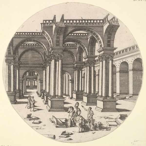 Editor: We are looking at Robert Adam’s etching, "Architectural fantasy of the ruins of an antique rotunda" from 1777. I find it so evocative. The crumbling architecture and tiny figures give a sense of monumental loss and the passage of time. What catches your eye when you look at it? Curator: The visual language here is potent. The ruin speaks to cycles of creation and destruction, ideas ever present. Look at the rotunda’s dome, fragmented, revealing its inner structure, its coffered ceiling. That pattern, those repeated squares, is that not a symbolic order imposed onto the chaos of nature, now fractured and overgrown? Editor: So, the geometric forms and precise structure represent a kind of intellectual aspiration that's being undermined? Curator: Exactly! It is undermined by the very fact of its ruination. Notice also the figures at the base. They’re not merely aesthetic devices. Are they excavating? Rebuilding? Or perhaps scavenging from the past? This blurring adds to the mystery. Consider the psychological weight of that ambiguity. Is Adam lamenting a lost ideal, or questioning the very nature of permanence and power? Editor: I never considered the workers to be ambiguous figures; they blend with the landscape. But their task… it’s undefined. It's true! I focused on the building itself, thinking it represents civilization, now crumbling. But I see your point that the human interaction here adds an element of speculation. Curator: Consider then the symbolic role of the ruin throughout history. In the 18th century, ruins held romantic significance. To see remnants of classical greatness triggered a meditation on time, mortality, and civilization itself. They serve as cultural mnemonics, whispering stories of those who came before. Editor: So much symbolism packed into one image. I’ll definitely think about the rotunda in terms of this visual and cultural context going forward. Curator: It's about unlocking that symbolism to deepen one’s viewing and understanding of ourselves in the present moment.