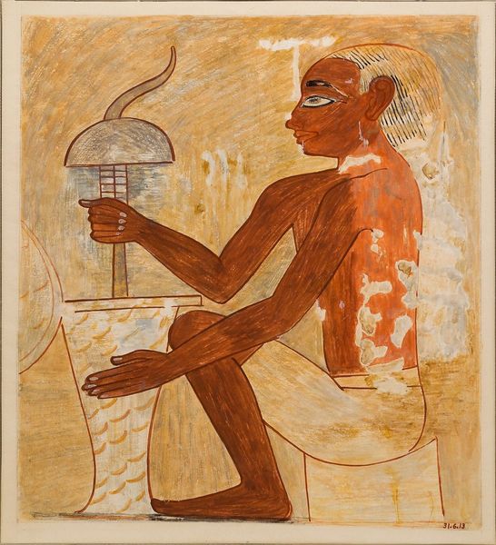 Nina de Garis Davies created this watercolor and pencil facsimile of ‘Sandal Maker, Tomb of Rekhmire'. Made in Egypt, this image derives from the decoration of an elite tomb. The figure is shown crafting what appears to be an elaborate sandal. Above and to the right are his tools, carefully arranged as if for inspection. The sandal maker sits upon a stool, his legs bare, wearing only a simple white kilt. The image is interesting for what it tells us about the social structures of its time. It may seem like a straightforward depiction of daily life. However, its presence within a tomb suggests a desire to preserve or idealize certain aspects of society. The figure's skill and dedication to his craft may have been seen as virtues worthy of commemoration. This was likely a conservative commission meant to reinforce the values of the elite class who would inhabit the tomb. To fully understand this work, we might turn to archaeological reports, studies of Egyptian social history, and analyses of tomb decoration. Each of these resources helps to interpret the meaning of this image within its original social and institutional context.