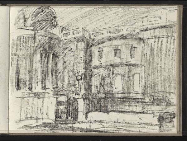 Editor: This is John Piper's "Palazzo Pesaro," from the Tate collection. There's no date listed, but the style feels mid-20th century. It's a very textured print, almost like a sketch. What do you see in this piece, considering its historical context? Curator: Piper often depicted architectural subjects, particularly those with historical or romantic associations. His war art, documenting bomb damage, really shaped how people saw those buildings. The Palazzo Pesaro here... do you think it's celebrating the grandeur or hinting at the fragility of Venice? Editor: I hadn't considered fragility. I was caught up in the imposing facade. Curator: Exactly! Piper’s choice to depict it with such expressive, almost chaotic lines undermines the classical ideal. It invites us to reflect on the weight of history and the ever-present threat of change. Editor: That's a powerful reading. I'll never look at a Piper print the same way again.