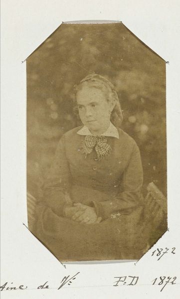 Editor: Here we have a photographic portrait, possibly of a young Surinamese girl, created by Eugene Guérin between 1875 and 1885. I’m struck by the formality of her pose contrasting with the slight disarray of her hair; it gives a sense of both dignity and vulnerability. How would you interpret this work? Curator: Note the tonality—the sepia palette is soft but the shadows articulate the subject's features, particularly around her eyes and mouth. Guérin has used light and shadow here as formal elements, not just for representational purposes, but to create a delicate study in contrasts. Observe the use of line, particularly the flowing lines of her hair against the more structured lines of her jacket, it suggests a deliberate arrangement intended to highlight the tension between freedom and constraint. Editor: So you’re focusing on the relationship between the subject’s pose and the technical aspects of the photo itself? Curator: Precisely. The framing, too – the oval vignette focuses attention on her face, eliminating distractions and forcing the viewer to confront her gaze. One must also note that the composition does not seem haphazard; can we agree that this formal ordering lends dignity? Editor: I see that. I had been focusing more on trying to understand her story. But it's also valuable to see how Guerin wanted us to view her through formal choices like tonality and shape. Curator: Exactly. This is why formal analysis can tell us so much about the artist’s choices. It is, ultimately, a construction, isn't it? A manufactured representation of a human being. Editor: That's given me a whole new way to consider portraiture. Thank you.