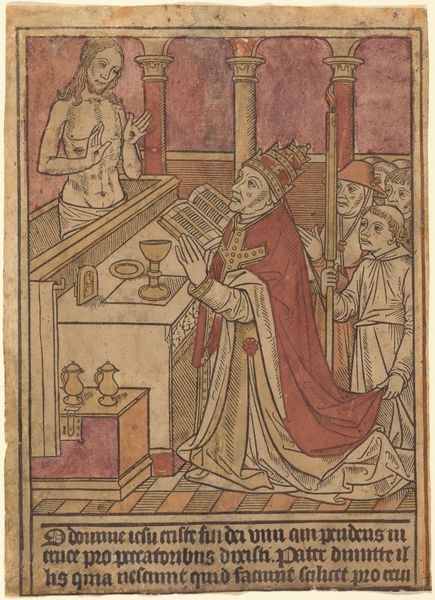 Curator: This print, titled "Miracle at Seefeld", dates back to 1484, a woodcut created by an anonymous artist. The piece encapsulates a powerful narrative within the Northern Renaissance style. Editor: It feels both intimate and grand simultaneously. The lines are so crisp, even with what appears to be hand-coloring, there’s a vibrancy here that draws me in. It’s striking how accessible this likely would have been at the time. Curator: That’s insightful. Woodcuts such as this played a critical role in disseminating religious narratives, especially in regions where access to more expensive art forms was limited. The medium democratized imagery, engaging a broader public. The Miracle depicted is a significant story in the area of Seefeld's cultural history and pilgrimage. Editor: Thinking about accessibility also leads to pondering how the audience might have intersected with those ideas in daily life—gendered expectations in terms of performing penitence, the pressure of being a "believer." Curator: Absolutely, religious artwork frequently served as an ideological tool, reflecting and reinforcing prevailing social norms. In the composition you can clearly see different clusters of people reacting to the events as a statement of community building through faith. The subject brings an understanding to the history of local devotional practices. Editor: It's this intersection where the aesthetic meets the socio-political that makes it very fascinating to study and, importantly, question today. The power dynamic is blatant in the scene as those in costumes kneel while others give. But it does seem so strange that an “anonymous artist” from so long ago still asks these questions about agency. Curator: Agreed, "Miracle at Seefeld" can be understood within the development of printmaking techniques that would eventually revolutionize visual culture. Editor: Looking at it now makes me think more broadly about the democratization of faith, then, compared to say the rise of digital spiritual influencers on social media today— how those with privilege are positioned differently across time. Curator: It highlights both the enduring power of images and their constant reinterpretation. Editor: The "Miracle at Seefeld," even centuries later, challenges our understandings of history, belief, and agency.