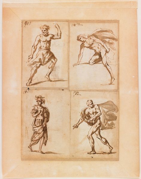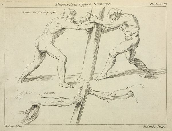 Curator: Take a look at this fascinating engraving by Peter Paul Rubens, titled "Three male figures in twisting positions." It seems to be an academic study of the male nude form. Editor: My first thought is: What powerful dynamism! Even captured in print, there is an intensity to each pose. Curator: Absolutely. It seems that Rubens’ exploration engages with representations of the male form as they existed prior to his time, particularly Renaissance interpretations that centered the human body as a measure of cultural values. Look closely at the tension he creates—one figure clenches his fist, ready for confrontation, the second wields what appears to be a spear or staff, and the third hoists a hefty mallet overhead. Editor: What strikes me is how Rubens employs line. Note the varied thicknesses in the engraving marks: He’s used delicate, wispy lines for musculature alongside confident hatching that reinforces shadow and depth. We can really visualize the physicality of how Rubens as a craftsman achieved the modulation from light to shadow. Curator: That careful attention speaks volumes. Think about the ways the academic art traditions of his time worked to enforce codes that positioned whiteness as the ideal. In the composition and in the bodies, there are echoes of social and historical tensions as well as ideas about status and even religious implications surrounding the display of power. Editor: Yes, though Rubens' hand gives us something to ponder here, even today. I'm compelled by the sheer physicality rendered in the material; by attending to the corporeal means through which bodies are perceived, it demands that we rethink idealized versions and cultural codes. Curator: I'm so glad we lingered on this artwork together; the print has invited us to reflect on the complex social frameworks of bodies—how form, gender, and power all merge together. Editor: And the process by which he represents that form also shapes our thinking. A great reminder that how and what something is made from really can change perception, even across eras.