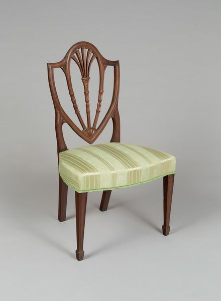 This Side Chair presents a fascinating interplay of form and function. Its wooden frame, with a seat upholstered in light pink and white stripes, invites immediate visual attention. The chair’s back, an openwork design of curved lines that support a fan-like crest, demonstrates the maker’s sophisticated use of negative space to create a visually stimulating composition. Each element, from the geometric inlays on the legs to the curvature of the back, reflects a careful consideration of structure and aesthetics. Notably, the juxtaposition of the chair’s linear and curvilinear elements establishes a dynamic tension. This tension is not merely decorative; it questions the traditional boundaries between art and utility. The chair’s function as a practical object is elevated by its complex design, which invites us to reconsider the aesthetic qualities of everyday items. This challenges fixed notions about design, underscoring how even the most functional object can embody significant artistic expression.