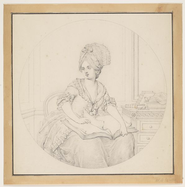 Editor: This is Nicolai Abildgaard’s "Profile Portrait of the Artist's Second Wife, Seated in an Armchair, Expecting," created between 1803 and 1809. It's a drawing with such a delicate touch; it captures her in a quiet moment. What symbols or meanings do you see conveyed in this portrayal? Curator: Well, pregnancy itself is a potent symbol: potential, future, and generational continuation all wrapped into one. Abildgaard highlights this in his delicate treatment of her form. Consider the soft drapery; it both conceals and reveals, hinting at the mysteries of creation. There's an emotional weight, wouldn't you say, in her downward gaze? Perhaps a meditation on motherhood itself? Editor: Yes, I see that. Her bowed head and clasped hands suggest a certain introspection. But why present her in profile? Does that choice carry symbolic weight, too? Curator: Absolutely. The profile is often associated with classical representations, lending the sitter a sense of timelessness. Think of Roman emperors on coins. However, it also creates a certain distance; we are observing her, but she is not engaging directly with us. It allows her privacy even in depiction, don’t you think? It also aligns perfectly with the ideals of Romanticism that prioritized emotional depth and a certain melancholy. Editor: So, the profile is both a link to tradition and a signifier of inner thought. I hadn’t considered that duality. Curator: Precisely. Artists often use symbols unconsciously as cultural languages, drawing on art history while imbuing them with new meanings for their time. The armchair itself becomes an emblem of domesticity and the female role in society. Editor: It's interesting how one image can be interpreted through so many different lenses—historical, personal, cultural… Thank you for unlocking so many insights into the symbolic power within Abildgaard’s portrait. Curator: My pleasure! Recognizing the layers of meaning transforms viewing from mere observation to a kind of empathetic participation across time.
