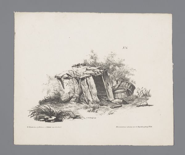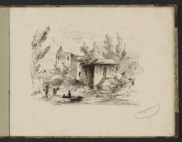 Curator: So, here we have a quick pen and ink sketch titled "Waterput met een afdak", which translates to "Well with a Roof," dating from about 1860-1865, created by Maria Vos. Editor: My first thought is of a fleeting moment captured. It feels raw and unpolished, like a glimpse into the artist's personal sketchbook. The stark contrast of the ink on toned paper creates a somewhat desolate, even lonely atmosphere. Curator: It’s important to contextualize this as a landscape, but more importantly as a personal study. The lack of refinement suggests it was never intended for public consumption, which changes how we can interpret its social and political implications. Editor: Exactly, this sketch prompts the question: who had access to clean water during this period, and who didn’t? Whose labor was involved in maintaining such a well? The inclusion of what seems to be some containers or vessels for water storage points to class disparity, if you will. Curator: You’re right to bring that to the forefront. This artwork provides a starting point for considering water rights and social access within 19th-century rural communities, reminding us that resources have always been unequally distributed. Looking at Vos's larger body of work, do you see these themes emerging there, or does this image stand more as an isolated reflection of her time? Editor: Isolated is maybe a bit too limiting of an expression for it, as most likely Vos was making statements on behalf of the rights and possibilities available to woman, but I don’t see a predominant trend or overt activism elsewhere. The strength of this sketch lies in its suggestive potential, encouraging us to excavate the hidden stories beneath the surface of rural life. Curator: I agree. I think by engaging with works like these we can uncover not only an understanding of the world they lived in but also open avenues to address existing socio-economic disparities. It also prompts discussion around art production that resists established modes of exhibition and dissemination. Editor: Ultimately, Vos's "Waterput met een afdak" functions as more than just a simple landscape study. It embodies an invitation to explore broader issues, opening up spaces for dialogue between art and society.