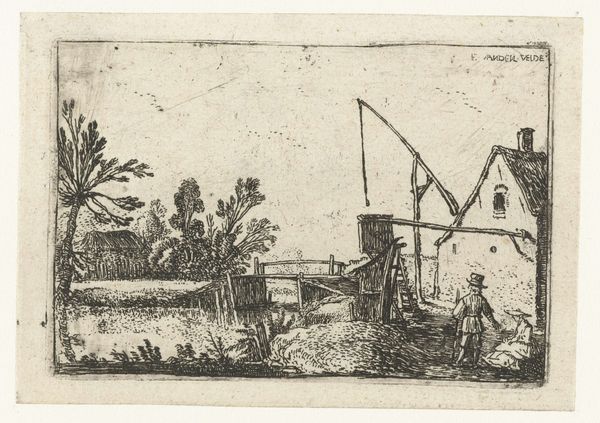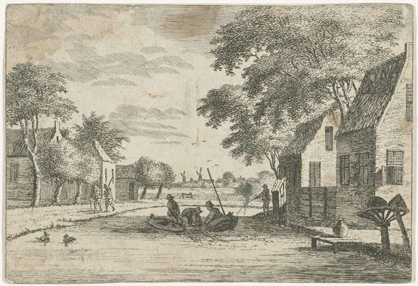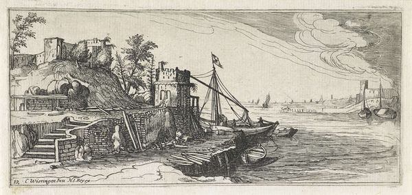 This is a winter cityscape by Simon Poelenburg, captured through delicate lines on what appears to be an etching. The composition is structured around a central waterway, flanked by architectural forms and human activity, evoking a feeling of serene, industriousness. The linear precision in Poelenburg's work offers an almost mathematical rendering of space and form. Notice how the stark lines of the bare tree on the left contrast with the geometric precision of the buildings and the rigging of the ships. Semiotically, the bare tree might symbolize winter's starkness, while the activity around the harbor suggests resilience. This piece invites contemplation on the relationship between nature and human endeavor. Consider the semiotic interplay between the detailed foreground and the softer background, where a bridge arches gracefully. It’s a subtle invitation to decode the relationship between near and far, known and unknown, echoing larger philosophical questions about perspective and understanding. It's a study in contrasts, where each element plays a part in a larger cultural narrative, continuing to inspire discussion and interpretation.