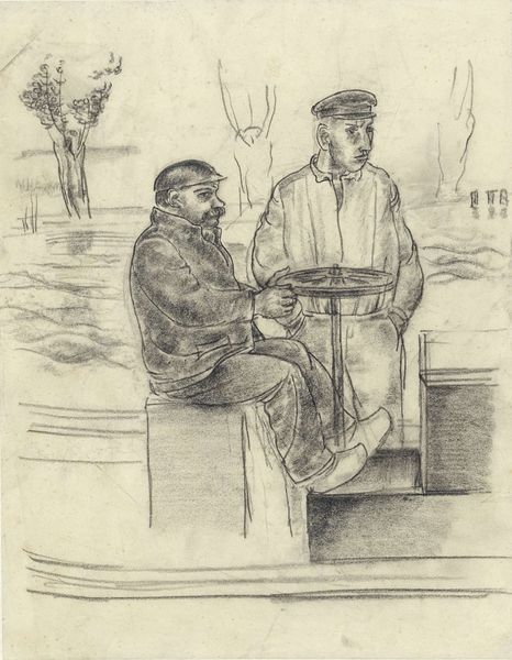 Curator: Ah, Henri de Toulouse-Lautrec’s “The Bartender,” circa 1900. An intriguing example of his work in charcoal and pastel. Editor: My first impression? Somber. Despite the bustle suggested by the scene, the charcoal work and the muted palette evoke a heavy atmosphere, like the air thick with smoke and unspoken stories. Curator: Absolutely. Toulouse-Lautrec was fascinated by the working class and the demimonde of Paris. This drawing likely captures a fleeting moment within the social ecosystem of a bar, a key space for encountering class and sexuality in Belle Époque France. The very choice of charcoal, an inexpensive and accessible material, speaks to this focus. Editor: I agree. And if you look closely at the figures, you can see subtle symbolism at play. The bartender, a solid, almost imposing figure, stands in contrast to the more ephemeral woman with an elaborate updo lurking in the background. There is an intriguing play of archetypes, here perhaps exploring societal roles of women and those in positions of service. Note also that almost hidden in the right corner is an obscured signature. It's very common for an artist of that era to inscribe their name on works, often incorporating this self-referential signature to solidify his position as creator of these worlds. Curator: Fascinating. Toulouse-Lautrec was certainly concerned with documenting the processes of nightlife; what materials are served, who the audience may be, how they were consumed... These drawings become primary evidence about Parisian urban culture and can show the material labor that happens in bars like these. Also note the compositional choice - the rising slope in the image's design could suggest something rising out of control, like tensions ready to break apart. Editor: Exactly, but also I think those materials, especially his distinctive application, allows us to trace a lineage of artistic expression that explores complex social spaces, one of class, status, performance, and cultural memory. The visual symbolism of “The Bartender" gives insight to unspoken themes prevalent in culture even today. Curator: Yes, though his access to specific spaces depended a lot on the economic realities of artmaking as labor! Fascinating points all around. Editor: Indeed. There's so much to discover in this evocative snapshot of Parisian life.