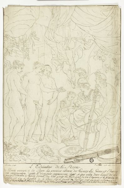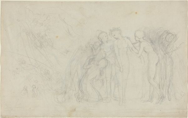 This drawing presents a classical scene with nymphs, putti, and possibly a satyr, rendered with delicate lines. The imagery evokes themes of fertility, abundance, and unrestrained nature, deeply rooted in classical mythology. Consider the reclining nymph adorned with fruits and vines. This motif hearkens back to images of Bacchus or Dionysus, gods of wine and ecstasy, embodying the intoxicating power of nature. We see echoes of this figure in countless depictions of earthly paradises, where nature's bounty is celebrated as a source of both pleasure and danger. This representation of the female form also recalls the "nympha" figure, the embodiment of life's energies. The satyr lurking nearby further emphasizes the element of untamed desire. Meanwhile, the putti – those chubby cherubs – hint at innocence and playfulness. These symbols engage us on a subconscious level, tapping into primal desires and fears. The cyclical progression of these symbols speaks to how classical themes resurface throughout art history, adapting and transforming to reflect the ever-changing human experience.