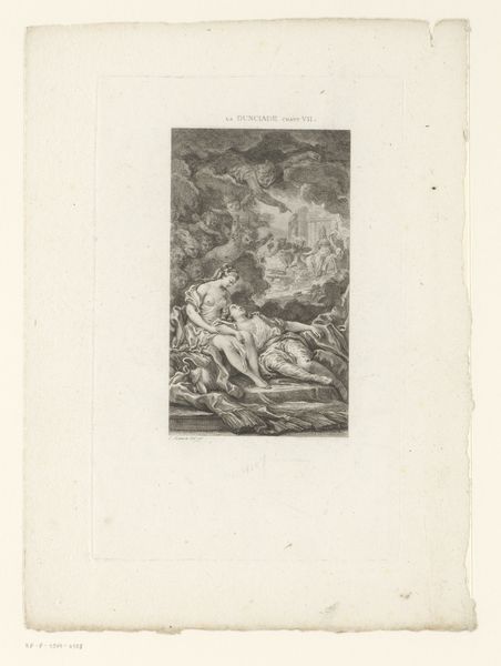 Editor: So this is an engraving from sometime between 1722 and 1774, called 'Rotspartij met links de heilige Willem van Maleval, liggend met de handen aan een tak gebonden' – quite a mouthful! It’s by Christian Wilhelm Ernst Dietrich, currently at the Rijksmuseum. I immediately notice the figure seems trapped. What do you see in this piece, especially regarding symbolism? Curator: I see echoes of a persistent human narrative: confinement and transformation. The bound figure of Saint William, nestled within a rocky landscape, speaks to a psychological enclosure. Rocks, often symbols of permanence and resistance, here amplify the sense of struggle. What cultural memory do you think a bound figure evokes? Editor: Perhaps the idea of sacrifice? Being tied up and isolated...it reminds me of religious stories where someone has to suffer for a greater cause. Curator: Precisely. The binding – those rough lines etched to hold him to the branch - is less about physical restraint, more about inner conflict, the testing of faith. The surrounding wild landscape hints at his isolation, his removal from societal norms. Does the untamed nature play any symbolic role for you? Editor: It does! It is like he is outside civilization...he has to find strength within himself, or from God. So, the image balances these feelings of external struggle and internal transformation. Curator: It does. The image holds both. These natural, yet severe elements, test, challenge and finally refine, linking sacrifice to deeper religious meaning. Editor: I've never thought of landscapes having such emotional layers. Thanks for pointing out all the different elements. Curator: And thank you for making connections between the emotional and cultural relevance of visual symbols. It has made me look at this engraving with fresh eyes.