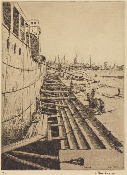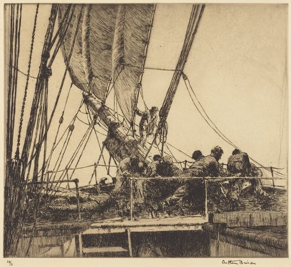 Editor: This is Arthur Briscoe's "The Futtock Shrouds," an etching from 1929. I'm struck by the steep perspective, looking down through the rigging of a ship. It creates such a strong sense of height and almost vertigo. What do you see in this piece from a formal perspective? Curator: Immediately, I notice the dominance of the linear elements. The composition is orchestrated through the diagonal lines of the rigging, creating a dynamic interplay with the more horizontal elements of the futtock shrouds themselves and the distant cityscape. The artist’s skillful deployment of line weight creates depth and directs the eye. How does this structured composition influence your reading of the artwork? Editor: I hadn't really considered the variation in line weight. Now that you point it out, the heavier lines do pull your focus upward towards the sailors, making them central even within the complex web of lines. The thinner lines suggest distance, making the buildings below seem almost dreamlike. It's clever. Curator: Precisely. The texture achieved through etching also invites consideration. The roughness adds a tactile quality, emphasizing the materiality of both the ship and the artistic medium. Does the texture itself suggest any specific qualities or sensations? Editor: It does add a rawness to the scene, maybe emphasizing the hard work and harsh conditions of maritime life. The fuzziness in the details gives an ephemeral quality to the architectural structures in the background, as if they're about to disappear. Curator: Consider the interplay between foreground and background, the solid figures of the sailors versus the hazy cityscape. It is through this careful orchestration of form that Briscoe communicates the essence of the scene. How do you find that resonates with your initial sense of vertigo? Editor: It now feels like a precarious balance – the sailors working high up in a world that’s literally and figuratively dissolving beneath them. I’d never considered the formal qualities contributing to such a layered narrative. Curator: Examining the formal properties allows us to appreciate the considered artistic decisions and how they contribute to the overall experience of the work.