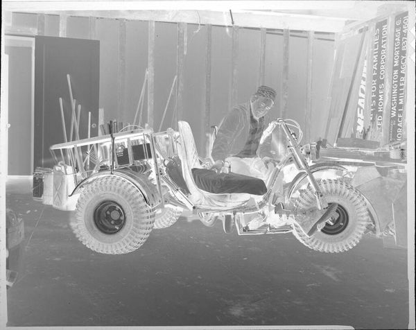 Curator: This photograph, by Jack Gould, is titled "Untitled (drivers drag-racing in tiny cars)." The print is quite small, only six by six centimeters. My first impression is it reminds me of a memory slowly fading. Editor: Absolutely. The photo's grainy texture and the racers themselves, poised on the brink, capture a feeling of anticipation, of liminality, perhaps even male anxiety. The small scale mirrors how our past feels now, far removed. Curator: I see the cultural weight of mid-century Americana here—a fascination with speed, with competition, rendered in miniature. The driver's helmet and goggles are iconic, yet slightly comical. The repetition of figures and karts is almost ritualistic. Editor: The photo encapsulates the performativity of masculinity within a capitalist spectacle. These races are obviously gendered spaces, revealing complex power dynamics and social hierarchies. And it's all presented as playful, harmless fun. Curator: Perhaps the blurring lends the image an honesty, reminding us that our projections onto the past are always clouded. Editor: Yes, a crucial point. It prompts us to question the myths of progress and leisure.
