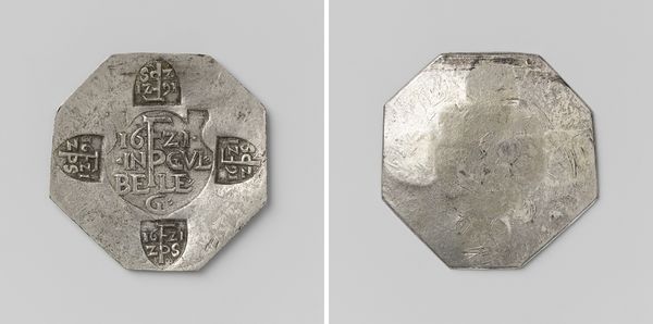 Curator: Immediately striking, isn't it? The simplicity of the form belies a powerful story, etched quite literally onto its surface. Editor: The metallic surface appears worn. I notice it’s a somewhat misshapen square rather than a traditional circular coin. It projects a mood of both endurance and perhaps a certain desperation. Curator: Precisely. What we have here is a halve koningsdaalder, essentially emergency coinage minted in Groningen during a siege. This piece of silver, possibly dating to 1577, represents more than just monetary value. Editor: Metal carries its own weight, doesn’t it? The fact that this was a measure born of crisis informs how we perceive it—the imperfections contribute to its presence. Was metal the material readily available to the besieged population? Curator: Most likely silver was available in a few locations as they were under attack. The coin speaks volumes about the city's resilience. Look closely at the face. The imagery, despite its rough execution, is replete with meaning. We see the heraldic eagle— Editor: That symbol anchors the coin. But look at its counterpart, the complete lack of any image. I am wondering whether the symbolic language offered only cold comfort in these dire moments. What do you think of the iconography here, stripped down to its basic message and metallic being? Curator: Absolutely. Stripped back, and almost raw, but potent, it is a poignant symbol of survival and ingenuity under extreme pressure. Each detail, the lettering, the image itself becomes a coded narrative of hardship and resolve. Editor: Its irregularity gives this half coin object an added resonance. By decoding what lies on the coin's surface, we gain a sense of the emotions that permeated Groningen’s population during that time. Curator: Exactly. I like to think this coin serves as a time capsule. Now what does it speak to you? Editor: It makes me think of structural linguistics in relation to this currency of conflict. It all seems part of some kind of cultural, historical code. Curator: Yes, in that history there are signs of a wider truth for future interpreters and scholars. Editor: Yes indeed! This historical relic has given me something to meditate on, a tangible relic.