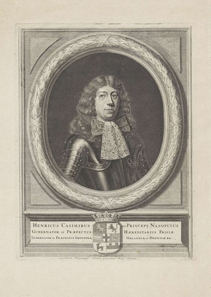 Jan van Munnickhuysen created this print of Hendrik Casimir II, Count of Nassau-Dietz, capturing the essence of Dutch aristocracy. Hendrik Casimir II’s portrayal is striking. The details of his armor and lace collar speak to his status and the rigid social structure of the time. Yet, the image transcends mere representation, offering a glimpse into the emotional landscape of power and privilege. His gaze projects both authority, and perhaps, the weight of expectation inherent in his position. Hendrik Casimir II inherited the title at the age of 8, after his father was accidentally shot dead. The young count’s life was closely managed by his mother, who acted as his regent. Munnickhuysen's work invites us to consider the person behind the title, reflecting the complexities of identity, shaped by historical and personal circumstances.