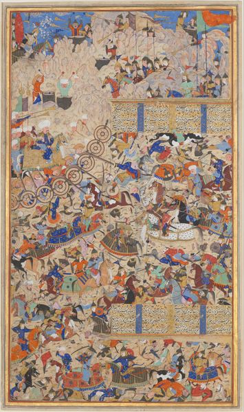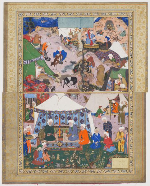 Curator: I find this scene utterly enchanting, teeming with life and exquisite detail. Editor: Enchanting, yes, in that it evokes a specific kind of hierarchical power structure with the ruler quite literally elevated above the throng. Curator: Indeed. We are looking at a folio titled "Entertainment in a Garden" from a Khamsa of Amir Khusrau Dihlavi, Matla' al-Anvar, created sometime between 1550 and 1599. The scene is brought to life with tempera, ink, and watercolors on paper. Note how every figure, every leaf, is rendered with precision. Editor: The meticulousness certainly underscores its value, doesn’t it? Consider the political context in which such a manuscript would be circulated—ostensibly a courtly scene of leisure. I can see its symbolic potency in solidifying dynastic authority and asserting dominance through patronage of the arts. Curator: I would point to the way the artist manipulates space. Look at how the composition pulls the eye upward towards the elevated figures. And how, despite the density of figures, a sense of depth is artfully suggested. Note the varying colours and meticulous layering that give the scene vitality. Editor: It's a carefully curated representation. The abundance of figures suggests an investment in conveying wealth, influence and a very specific visual culture. The very placement of individuals reinforces this. Who is allowed proximity? Who is below? Who is ascending via ladder, a staged event with social consequence? Curator: Even in the stylized depiction of nature, there's a kind of formalism at play, wouldn't you agree? Each leaf is distinct, each branch carefully placed... contributing to a visual harmony. It’s a masterclass in controlled, aesthetic representation, designed to delight the senses, rather than mirroring reality directly. Editor: A designed reality serving a purpose: this artwork tells us volumes, through visual cues and established roles, about social life, values, and how political image-making functioned. I wonder who this patron was, and how they hoped their image would last. Curator: Thinking about the artist’s intent – whether purely aesthetic or politically charged – elevates our understanding of its intricate details, such as line work, colour selection and their interaction. Editor: And viewing this artwork provides invaluable context on a specific time and social status while considering both the political goals and cultural values of the day.