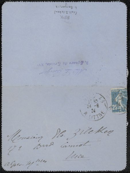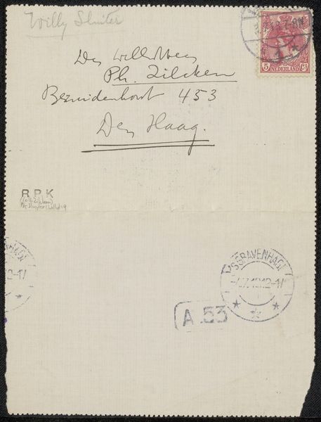 Editor: This artwork is entitled "Brief aan Philip Zilcken", possibly created in 1924 by Lya Berger, and made with drawing on paper, possibly colored pencils too. It looks like an envelope. What I immediately notice is how the careful script and the stamps hint at a formal mode of communication that is much less common today. What do you find particularly compelling or relevant about this piece? Curator: For me, what is intriguing is its existence as an artifact embedded in social networks and institutions of the time. It's not just a letter; it's a fragment showcasing artistic patronage and the physical, postal infrastructure of artistic exchange. Who were Lya Berger and Philip Zilcken within the art world? What did their relationship signify, socially and professionally? These questions frame the artwork within its historical context. Editor: So you are saying the artwork serves as a kind of record of past social dynamics. Curator: Precisely. We can also think about how postal systems enabled art to reach broader audiences – not necessarily artworks themselves, but letters discussing and shaping the direction of art. Imagine the artistic discourse that happened outside formal institutions but within these types of correspondence. It influences artistic reputations and decisions. Is this starting to influence how you see it now? Editor: It is. It prompts us to consider these smaller dialogues as being as crucial to art history as major museum shows or institutional decrees. So every aspect, the handwriting style, the type of paper and the stamp might contribute in telling the tale? Curator: Exactly! Every element acts as a piece of evidence contributing to our understanding of artistic practice and its relation to culture and society at that time. Editor: I'll never look at a piece of mail the same way again. Curator: Hopefully. It enriches our understanding, seeing how social connections are visualized.