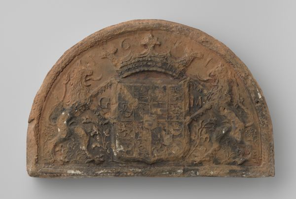 This earthenware stove plate shows the coat of arms of Prince Maurits of Orange-Nassau. It's a fascinating symbol of identity and power from a time of immense social and political upheaval in the Netherlands. Maurits, as a leader in the Dutch Revolt against Spanish rule, embodied a rising sense of Dutch national identity. The coat of arms, flanked by regal lions, isn’t just a symbol of family lineage, it’s a statement of political authority and military strength. The plate's creation reflects a society grappling with religious and political divisions. The Dutch identity was forged in the crucible of war, and this artwork, while seemingly traditional in its heraldic imagery, speaks to the emergence of a new nation and its struggle for self-determination. It's a reminder that even the most formal symbols can be charged with revolutionary meaning.
