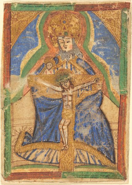 Editor: So, here we have "Paradise with Christ in the Lap of Abraham", a drawing from around 1239. It’s very intricate; the miniature format and vivid watercolors are really captivating. I’m curious, what strikes you most about its depiction of Paradise, considering its historical context? Curator: What immediately grabs my attention is the way power is visualized in this period. Notice how Abraham, traditionally a patriarch, is presented enthroned, echoing the imagery often associated with Christ himself. What does it say about the period's power dynamics and how salvation might be visualized through the lens of earthly power? Consider too the individuals offering chalices filled with leaves or fruit; this might be linked with eucharistic offerings, therefore, tying salvation with the institution of the Church. Editor: That's fascinating. I didn’t think of Abraham’s position that way. What about the figures in the corners, pouring water? What role might they play in constructing Paradise? Curator: They suggest a paradise where basic human needs are abundantly fulfilled; where scarcity doesn't exist. These vignettes play into the medieval concept of earthly paradise and how these representations can simultaneously offer comfort but also reinforce the viewer’s dependency on the institution and figures featured, suggesting their active role as distributors of divine abundance. It’s intriguing how they control and funnel that essential resource, no? Editor: I never thought of it as control! This definitely shifts how I interpret the scene. Thank you. Curator: And thank you. Thinking about Paradise through the lens of social power keeps this image alive and relevant.