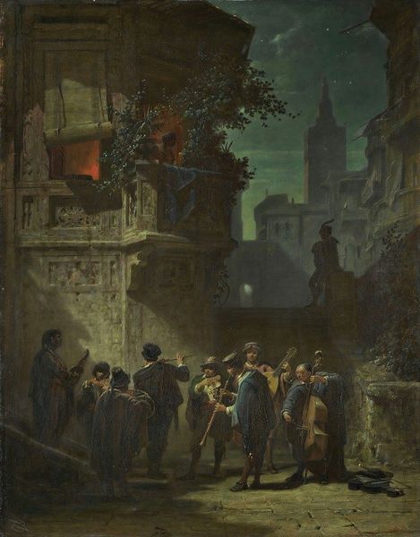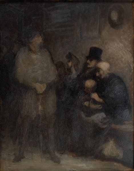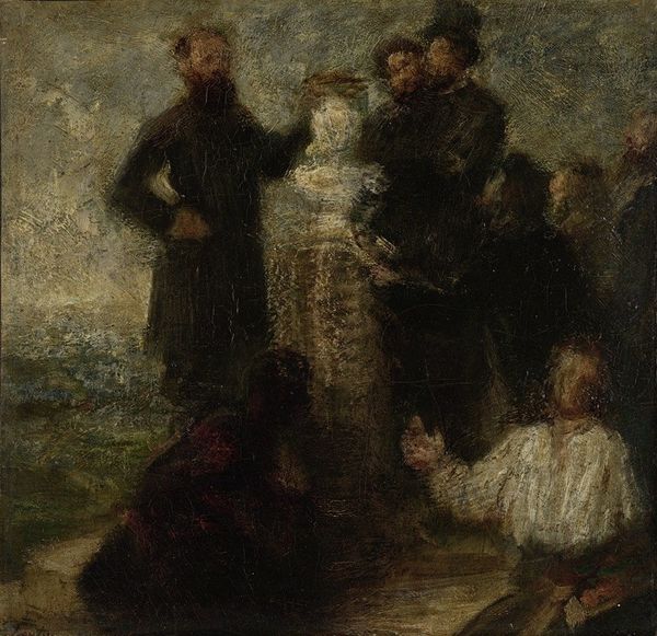 Editor: Here we have Hein Burgers' oil on canvas, "A Jewish Funeral," dating from sometime in the latter half of the 19th century. It’s overwhelmingly somber, isn't it? All that dark clothing against the grimy buildings. What do you see in this piece from a historical perspective? Curator: The painting operates within a historical context rife with both societal shifts and artistic movements. Considering the rise of Realism in the latter half of the 19th century, with its commitment to portraying life as it truly was, devoid of idealization, we must also view the painting in its historical depiction of marginalized communities. What can the institutional presentation of such art achieve today? Editor: It's true. Seeing it here changes things, doesn’t it? I'm now considering how a museum's decision to display it shapes the narrative. Does it perpetuate stereotypes or foster empathy? Curator: Exactly. The painting's cultural significance is deeply tied to its representation and reception, both then and now. This is about the gaze of the viewer; how it would have been perceived in contrast to those living in the Jewish community and how different factions in society politicized that view. I am curious what your own politicized interpretation of this work could be? Editor: Well, given that anti-Semitism was virulent in Europe, particularly during this period, depicting a Jewish funeral with such... almost grotesque somberness could be interpreted as reinforcing negative stereotypes. Then again, is it truly our place to interpret artwork through an ethical lens that could only have developed so long after the painting itself? Curator: Precisely. Ethical judgements are subjective, but recognizing the potential for harm allows institutions to engage more thoughtfully. Contextualizing it is key; revealing biases rather than masking them. Editor: I see. Thanks, it really opens my eyes to the responsibility museums bear. Curator: It's a crucial consideration. Thinking critically about representation enriches the artwork, and the social role it could come to play in contemporary times.